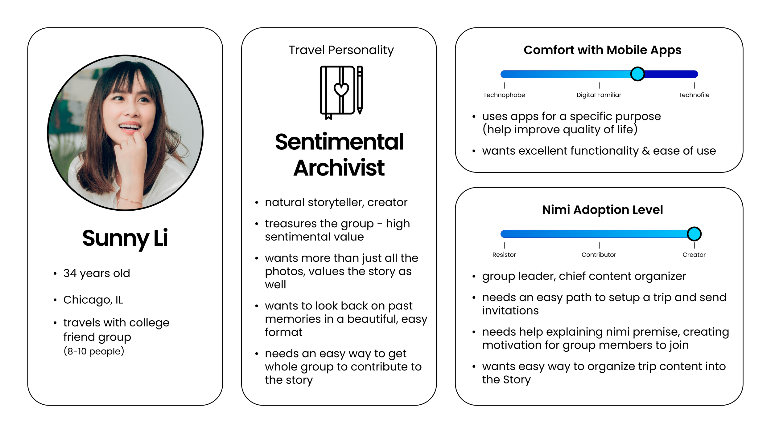I helped the product team focus in on a key directive: build for the digital familiars. Gen X and Millennial users are quintessential nimi trip creators because they are old enough to see every trip they go on as sentimental (kids, family, school reunions, etc) and young enough to want to share the highlights on social channels (where their public life exists).